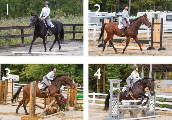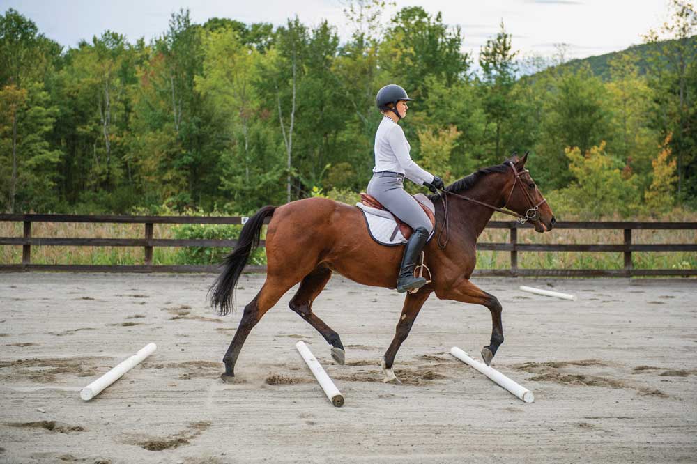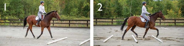 Next, try a line of two poles, placed several strides apart. Ask a helper on the ground to adjust the poles to suit your horse’s natural stride length.