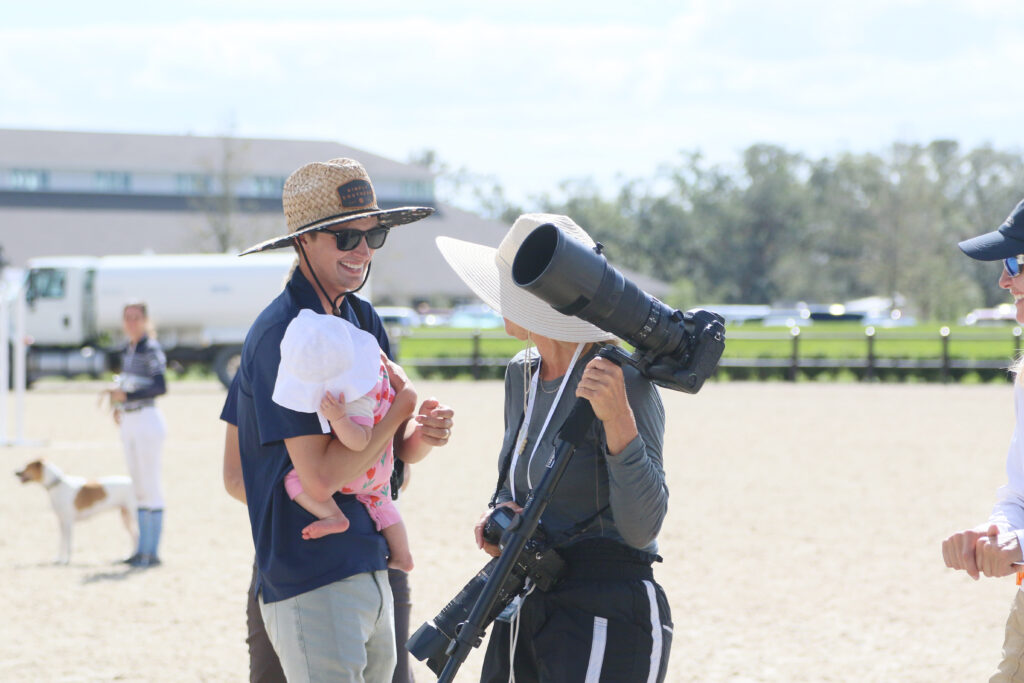 Fletcher’s husband, Jacob, totes daughter Sparrow around while his wife competed at TerraNova last November. Fletcher strives to show her fellow female eventers that they can balance motherhood with an eventing career. ©Alana Harrison