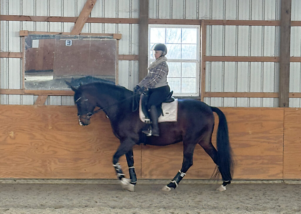 “As horse and rider, we’ve been together 7 months. I am 57 years young and have been riding again for two years after a 24-year hiatus. Doctini is an 8-year-old Trakehner mare trained up to Fourth Level. She’s recently back to work after three month’s rest recovering from founder.”
