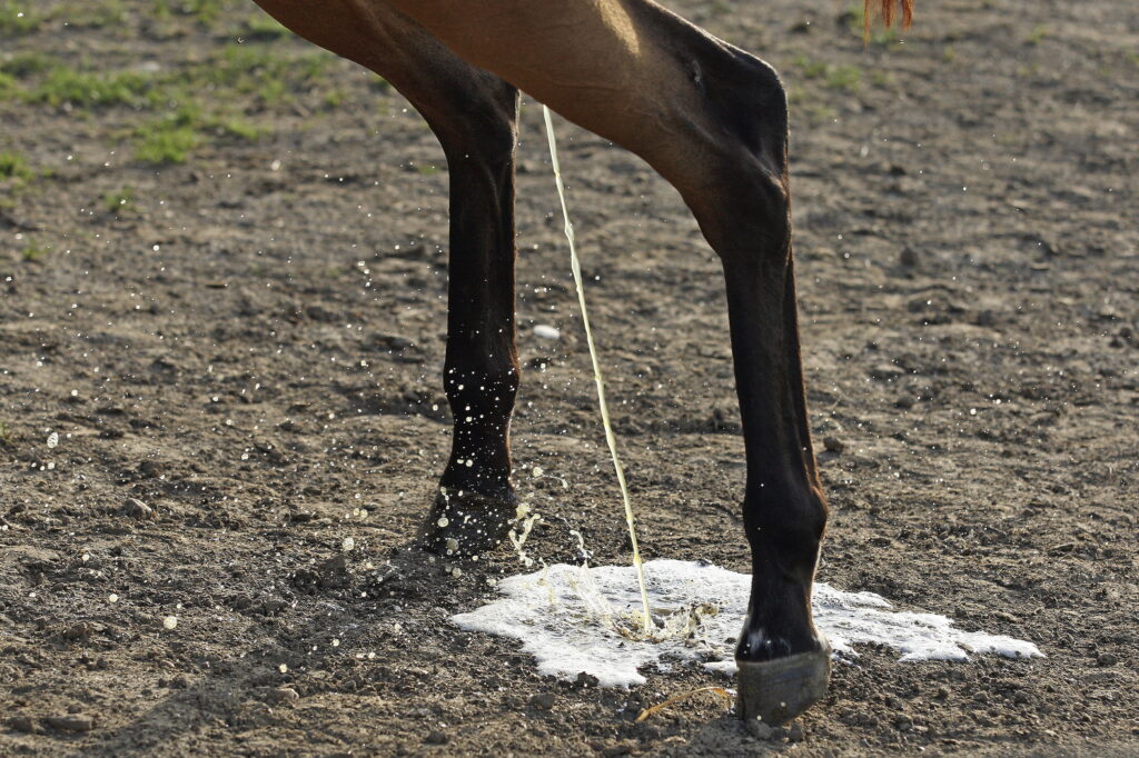 Beyond the behaviors that signal she’s ready to breed, a mare in heat may also exhibit some degree of change in attitude and performance—but not all mares do. The most common behaviors are tail swishing, squealing and kicking as well as excessive urination. In addition, physical discomfort from the pain of a developing follicle may cause a mare to be uncooperative and hard to ride or train, leading to decreased performance under saddle.