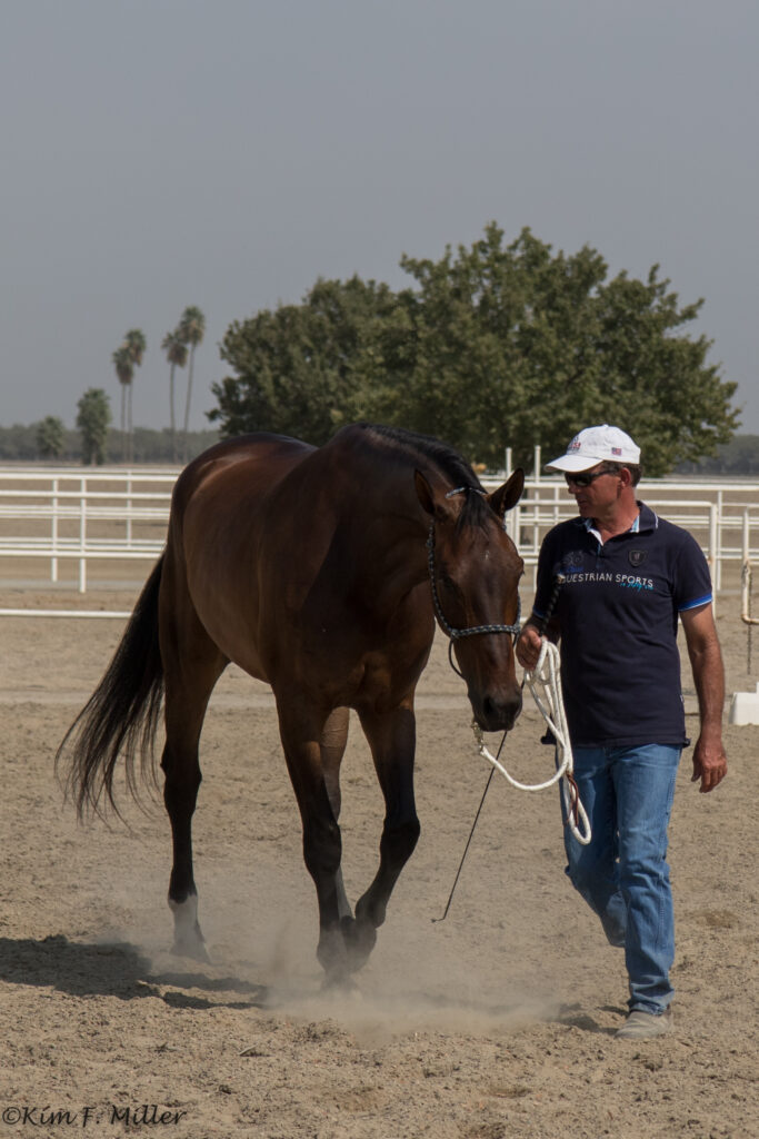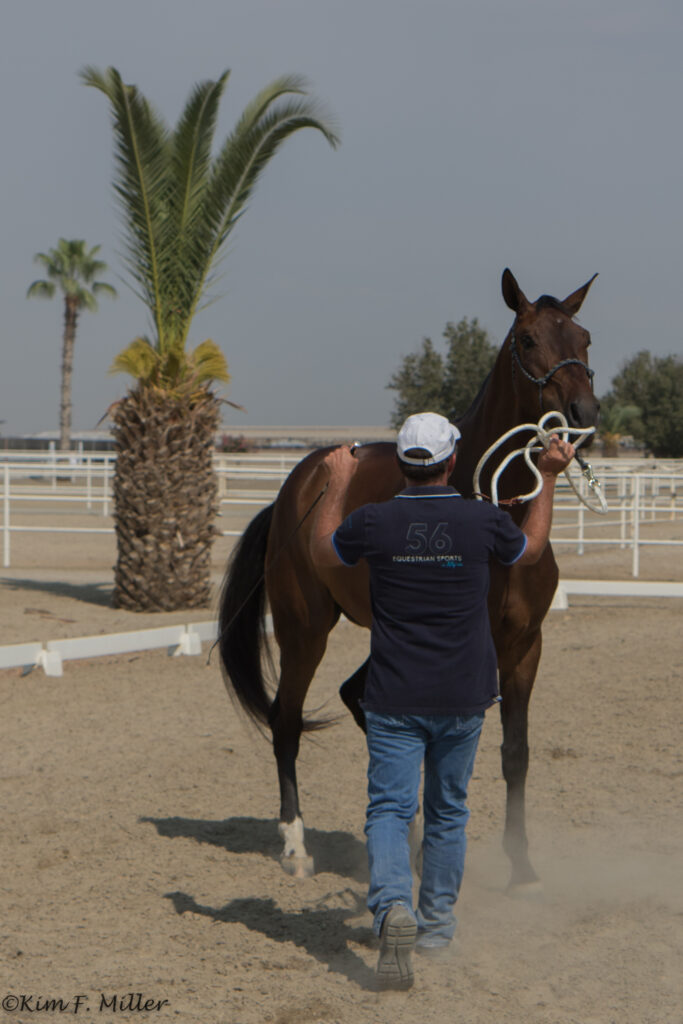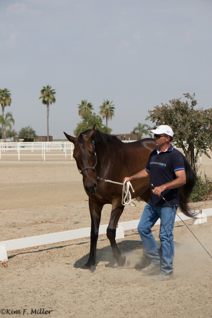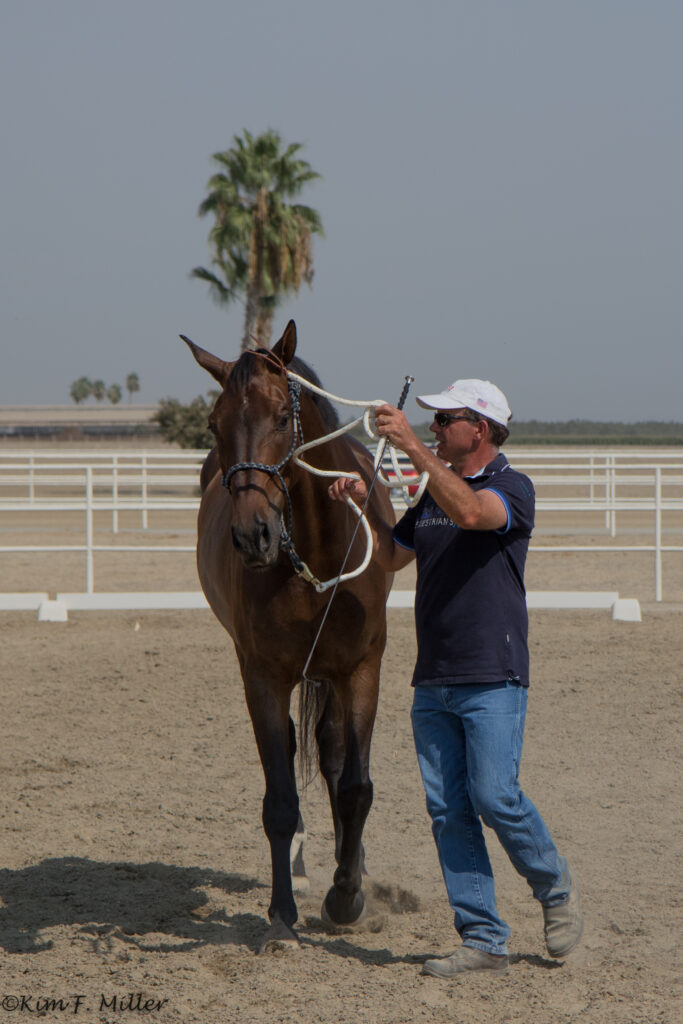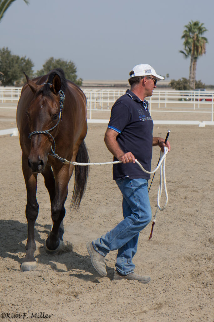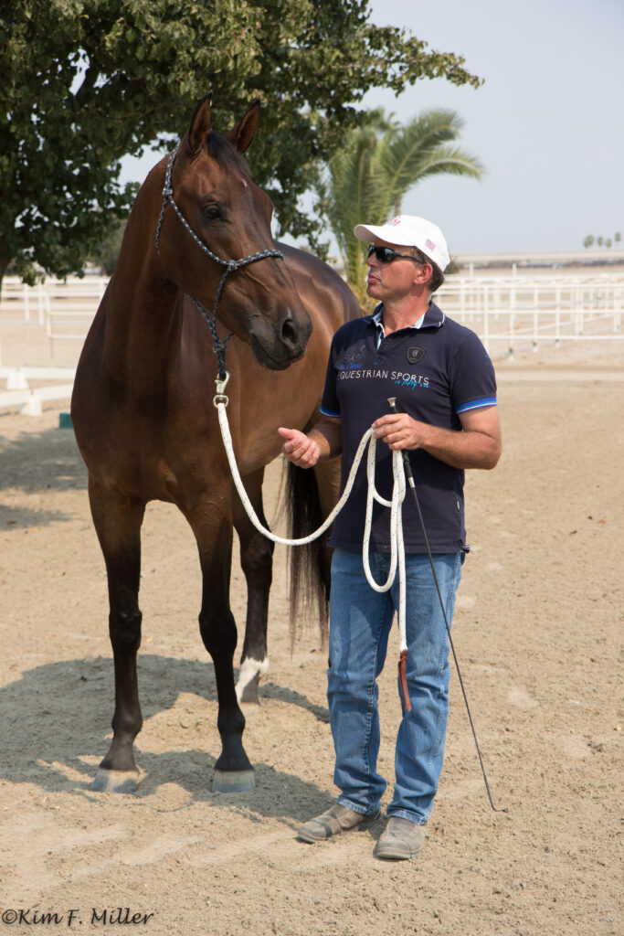 Getting the horse out of my space is the first step. When a new horse comes to me, I may spend a whole lesson on this. After that, I typically deal with it when I’m working with the horse—from when I’m catching the horse and leading him to the cross-ties or if I’m standing still somewhere. With a stallion I once worked with, for example, every time I went into his pen to catch him, I would make him take a couple of steps back away from me. It was asserting that he would submit to me and respect me.