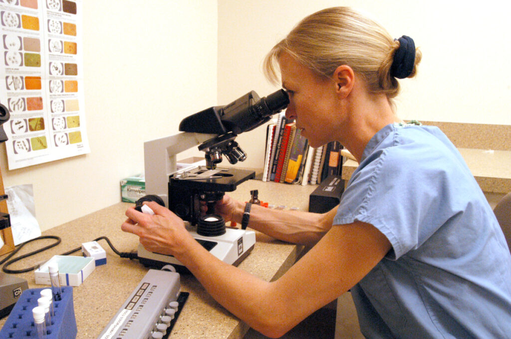 A veterinarian examines a manure sample under a microscope to measure if the horse is a low, moderate or high shedder. ©Dusty Perin