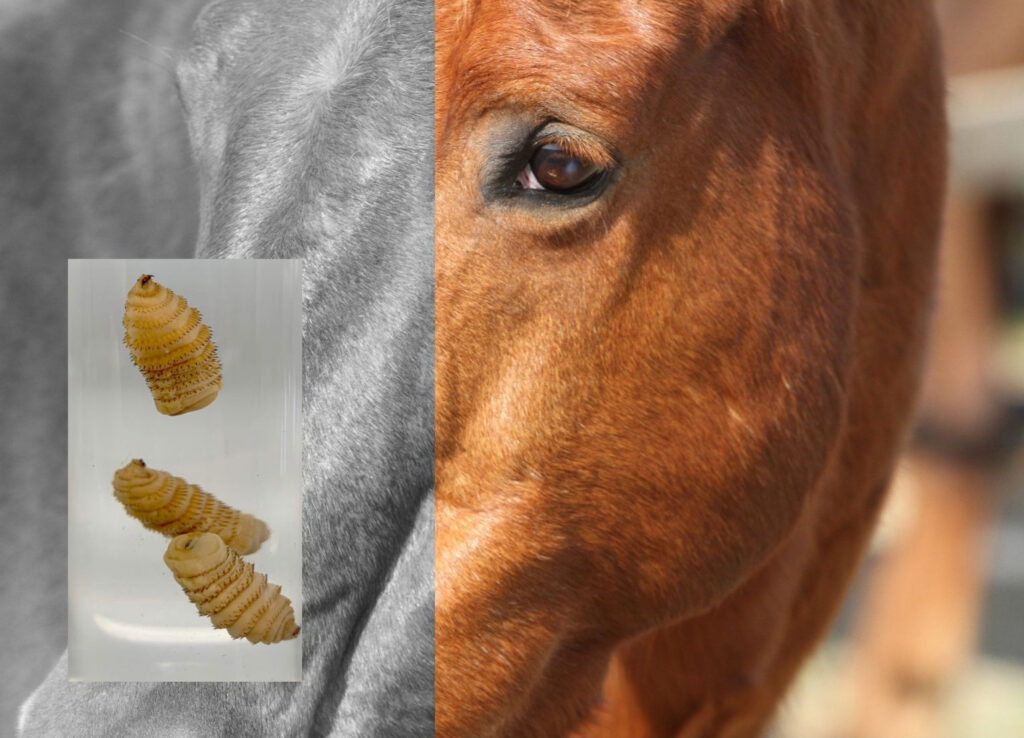 Bots: Botflies lay eggs on a horse’s hair; when the larvae hatch, they migrate toward the mouth to enter the digestive tract or the horse ingests the larvae when he licks or bites his coat. The larvae then attach to the horse’s stomach wall or the first few inches of the small intestine. Botflies are relatively benign but in large numbers they can cause damage to the stomach lining or block passage of food from the stomach to the small intestine.