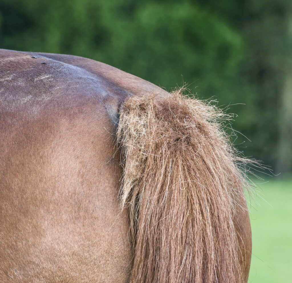 Pinworms: These parasites rarely lead to severe disease in horses, but they do cause acute itching and tail rubbing. Pinworm eggs can be identified using a “Scotch Tape test,” in which a veterinarian takes an impression of the horse’s skin near the rectum and then examines the tape under a microscope.