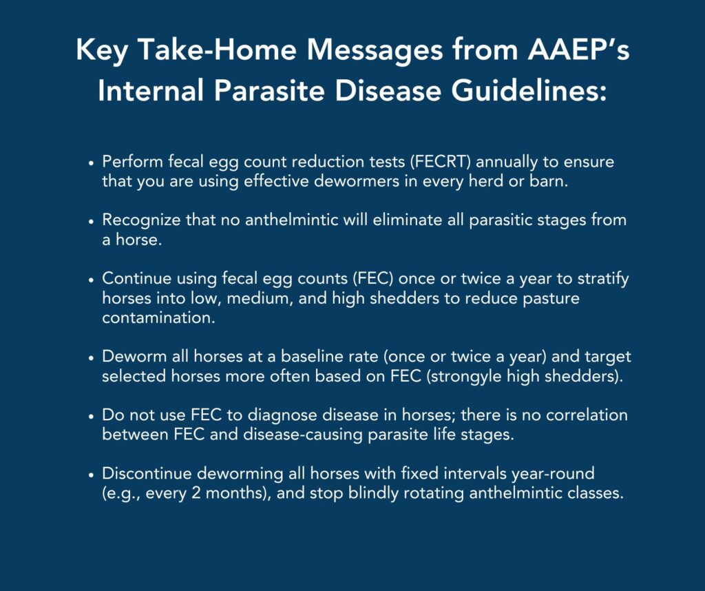 As experts gained more scientific knowledge about equine parasite control over the years, the American Association of Equine Practitioners (AAEP) formed a task force to provide a more modern and comprehensive set of recommendations. Nielsen explained the task force’s goal is to help veterinarians and owners determine the minimum number of deworming treatments all horses should have with certain medications. The guidelines also recommend using specific diagnostic tools to measure treatment effectiveness and to help owners determine whether horses need further treatment.