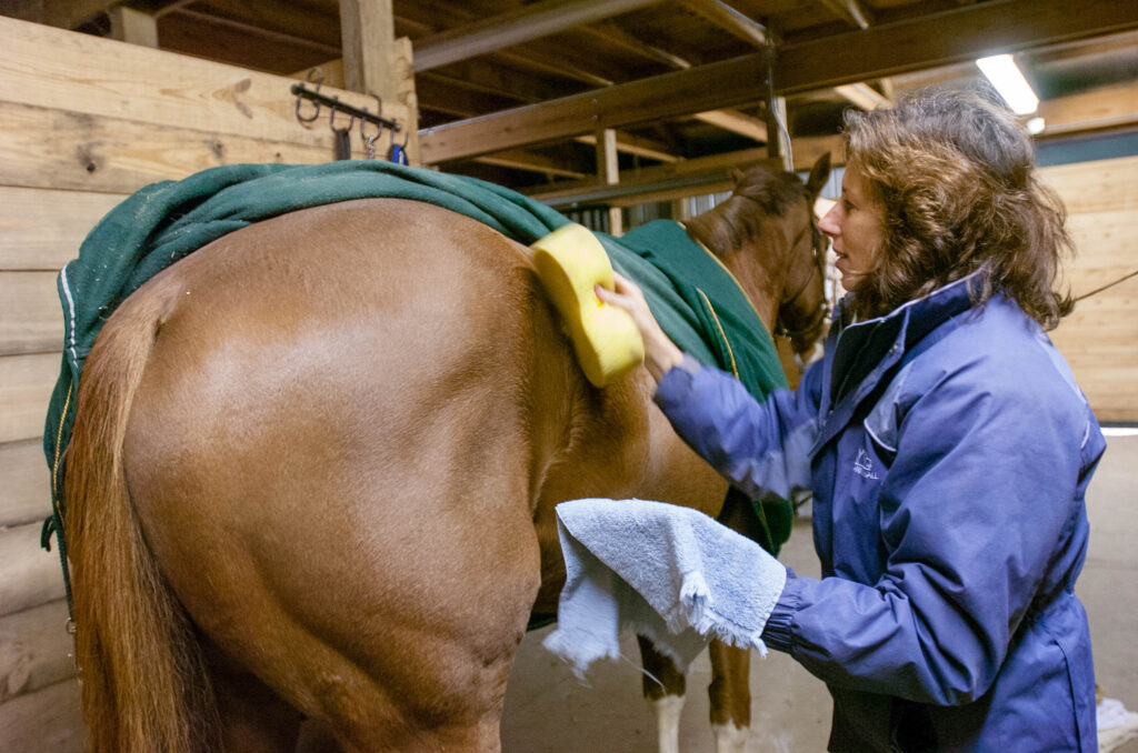 If it’s absolutely necessary to wash his entire body, you might consider washing one side of your horse at a time, making sure to sweat scrape and towel his clean side before tackling the other. By washing small areas at a time or only areas that really need to be cleaned, you can limit the drop in your horse’s temperature.