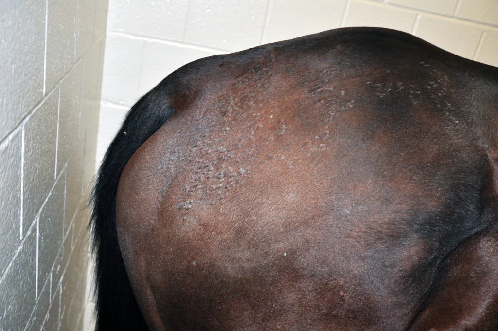Rain rot can be identified by looking at the affected area. “If the horse has a tender, crusting dermatitis of its topline that developed after some heavy rain and minimal sunlight to dry out the coat, the diagnosis is fairly straightforward and most veterinarians will go right to treatment,” Dr. Miller says.