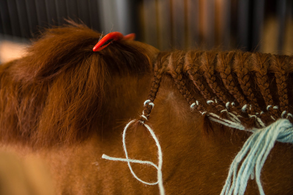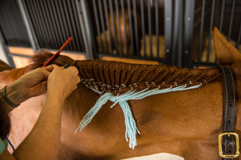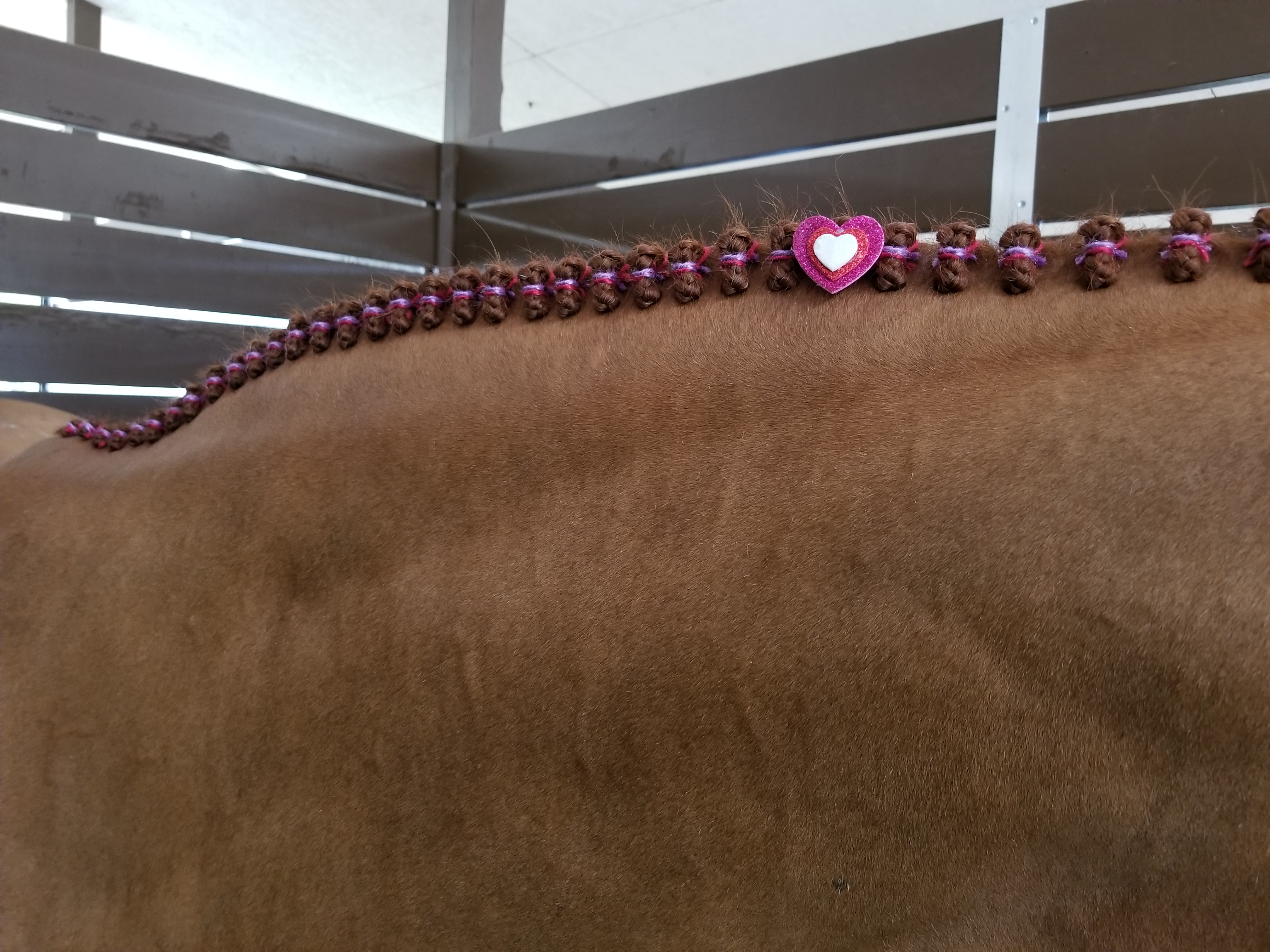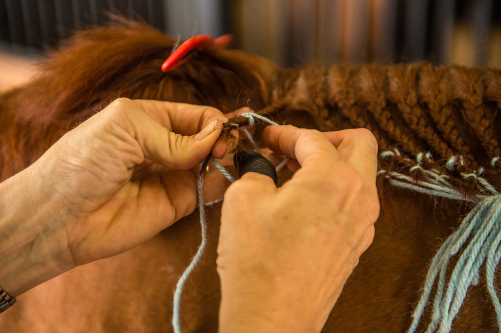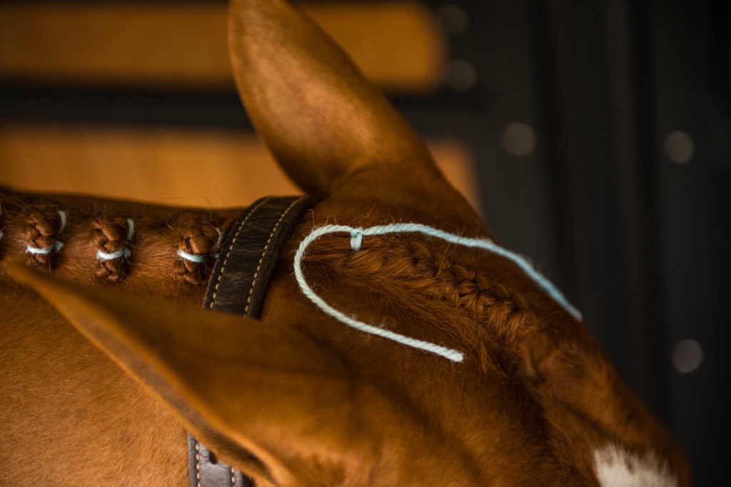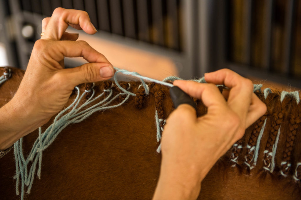 I’m a firm believer that people should try to have fun with braiding and do what they like. Don’t be afraid to use color! But keep in mind using color is a bit more advanced because it draws a lot of attention to the mane and can highlight mistakes. Navy blue yarn is a staple in my arsenal, even for conservative classes, as is slate blue yarn, which is a must-have for white manes. I like to help my clients stand out by braiding with brightly colored yarn for themes or holidays, and I even add glittery ribbon or buttons to add a tasteful sparkle when appropriate. I usually like putting these embellishments in the top third of the mane.