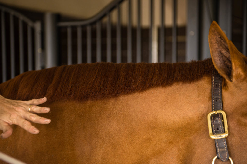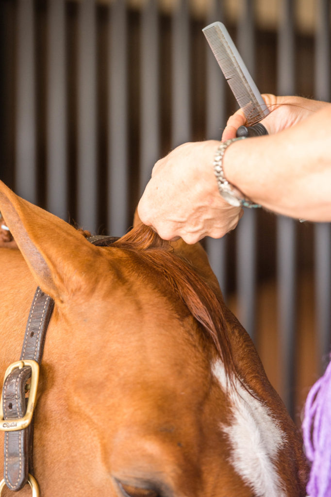 The number of braids in the mane depends on the individual horse. A daintier horse with a thin scalp—where the hair meets the skin—and fine hair should have smaller braids to match his neck and stature, and vice versa—a big thick mane needs bigger braids. You wouldn’t want to put tiny braids on a big horse with a thick mane—they would look like raisins! If a horse has coarse mane, each hair diameter is thicker and wider, so the braids need to be bigger. Using wider sections of hair will make the braid thicker. You want to try to make all the braids the same thickness by making the sections of the braids a consistent size. I braid everything I can. I don’t believe in having a bridle path because it ends up getting longer and longer every time the horse is trimmed and then the first braid starts too far back. I braid close to the withers, too.