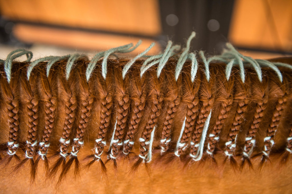 Just like when you braided your horse, make sure he is standing on even ground and use your step ladder. Looking at your horse’s mane, you should only be able to see the yarn at the very top of the braid and in the center of the braid.