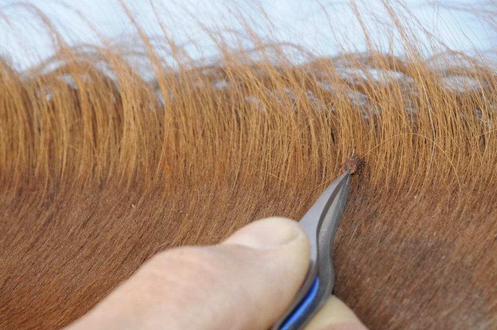 - Groom your horse daily with special attention to top tick-bite zones like the base of the mane and tail and around the ears, throatlatch and belly. If you find a tick, use tweezers to grasp it right at the skin where its mouthparts are embedded. Pull gently up to remove the tick and then kill it.