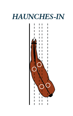 If your horse is struggling, start with shoulder-out to help him better understand what you’re asking. Ask for a shoulder-out by keeping your outside leg on and the haunches in while keeping his head and neck facing the outside. Think shoulder-out, haunches-in, and that will help you establish your outside leg, which will bring the haunches in. You’ll know it’s OK to try true haunches-in when he moves off your outside leg easily. At that point, you can add the inside bend by slowly flexing the jaw to the inside by squeezing your ring finger repeatedly until he supples. Ask him to stay in that position while encouraging him forward. You may need to go back and forth between the lateral movements and being completely straight until your horse figures it out and builds strength and coordination.